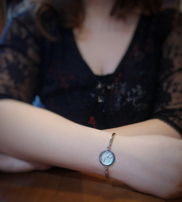 • Une pièce de verre fusion faite de verre dichroïque argent, avec des reflets bleus est utilisée comme pièce centrale sur ce bracelet fait en acier inoxydable, un métal qui restera beau au fil du temps! Il est ajustable à l'aide d'une chainette à l'arrière du bracelet et est attaché à l'aide d'un fermoir type pince de homard.