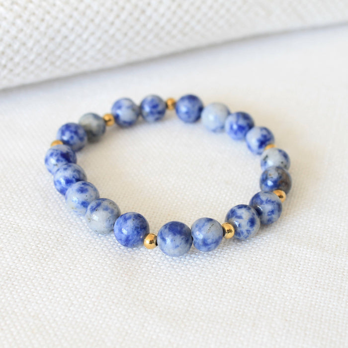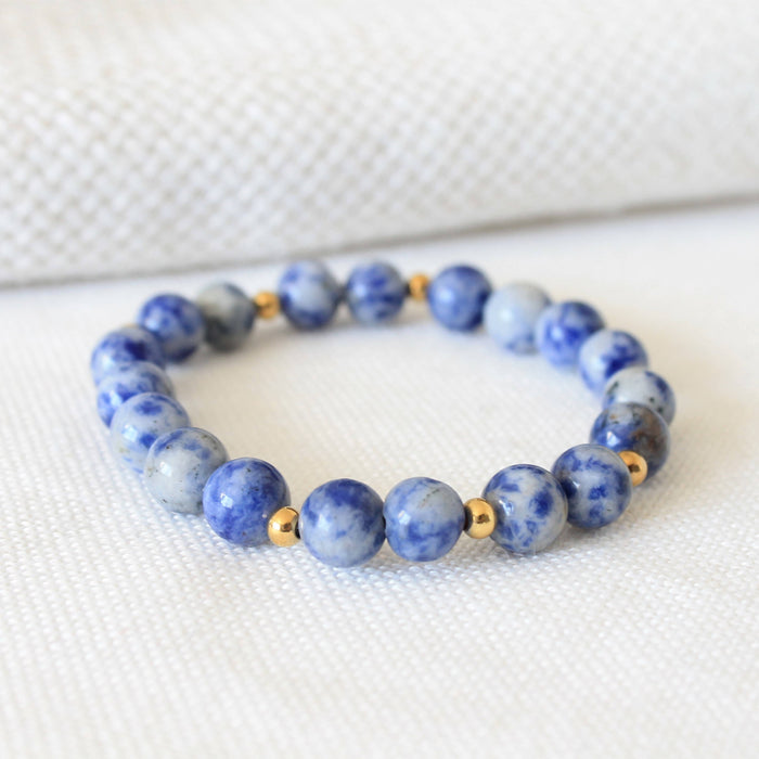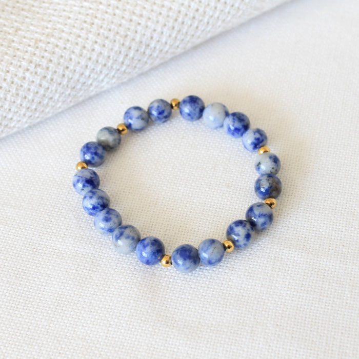 Bracelet élastique sagesse en pierres semi-précieuses : lapis lazuli denim et acier inoxydable doré