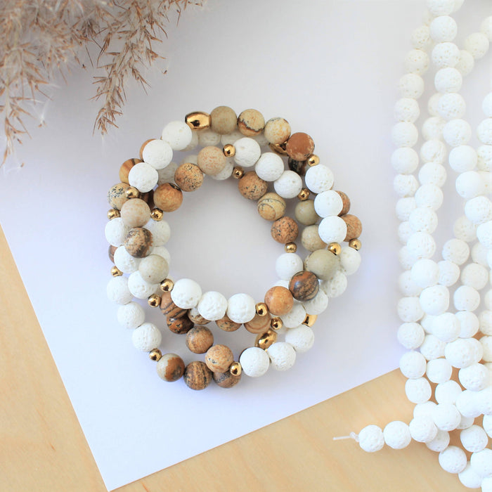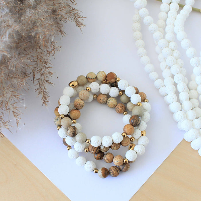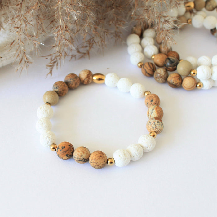 Bracelet paysage en pierres semi-précieuses pour femmes : jaspe paysage, pierres de lave blanche et acier inoxydable doré