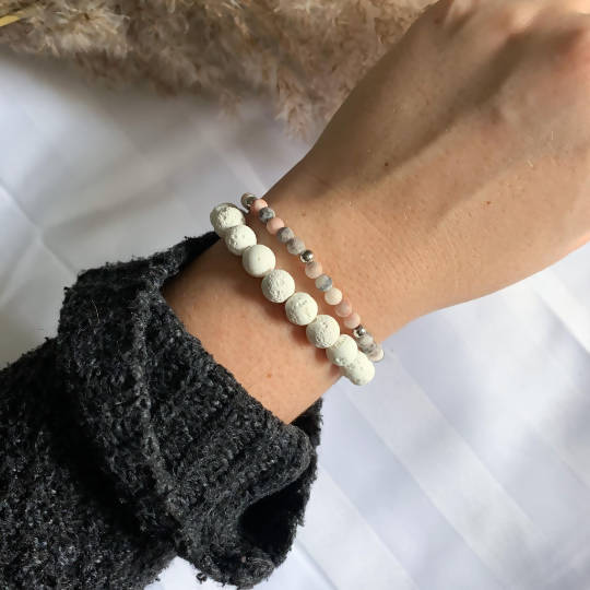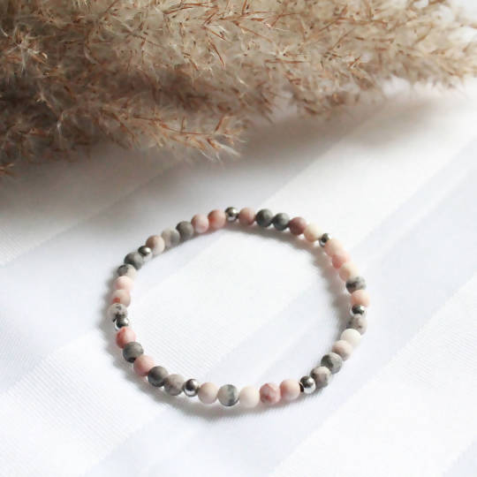 Bracelet élastique pour femmes fait de petites billes (4mm) de Jaspe zébré rose et acier inoxydable. Avec ses pierres roses, grises et blanches, ce bracelet créé un look doux, féminin et minimaliste. Les petites billes en acier inoxydable argenté ajouteront un petit côté brillant.