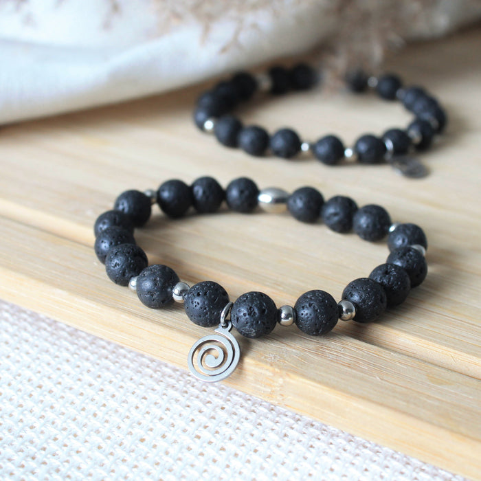 Bracelet spirale diffuseur d'huiles essentielles pour femmes et hommes en pierres de lave noire, acier inoxydable et breloque spirale