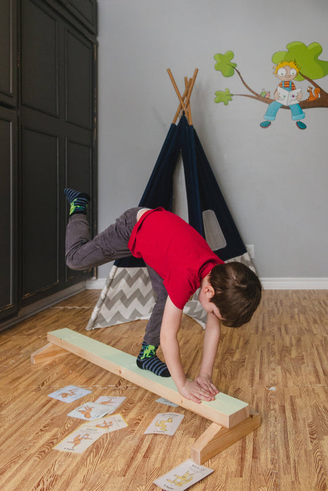 Le jeu de cartes peut être utilisé sur une poutre de gymnastique, sur une ligne tracée au sol ou tout simplement en plein milieu de votre salon. Enlignez les personnages et voilà, une routine de gymnastique à faire devant toute la famille.