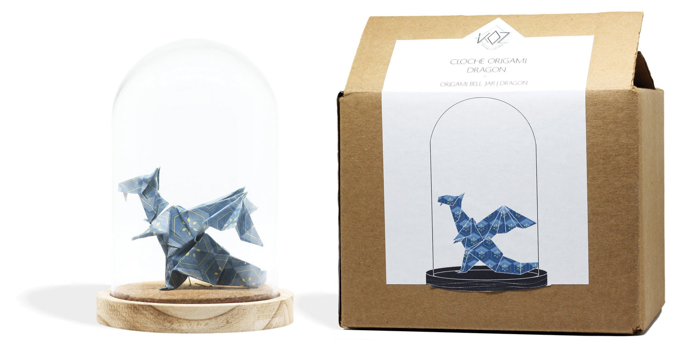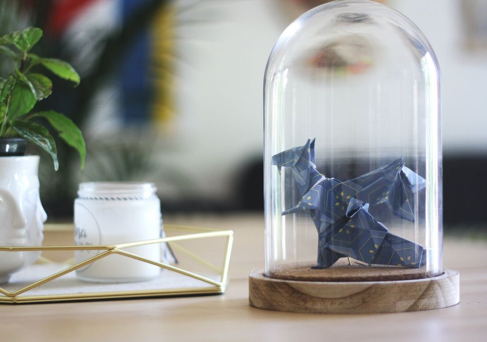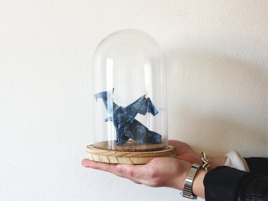 Cloche décorative contenant un modèle d'origami (l'art japonais du pliage de papier) - ici un dragon plié dans un papier à motif bleu avec hexagones jaunes. Réalisée à la main, cette cloche est prête à être posée sur une étagère, une table ou un bureau pour venir compléter n'importe quel décor! C'est un objet unique et original à offrir en cadeau ou pour se gâter.