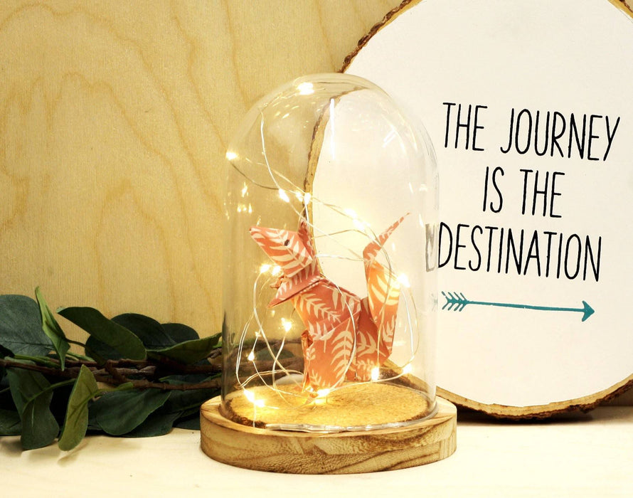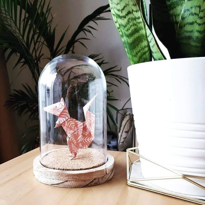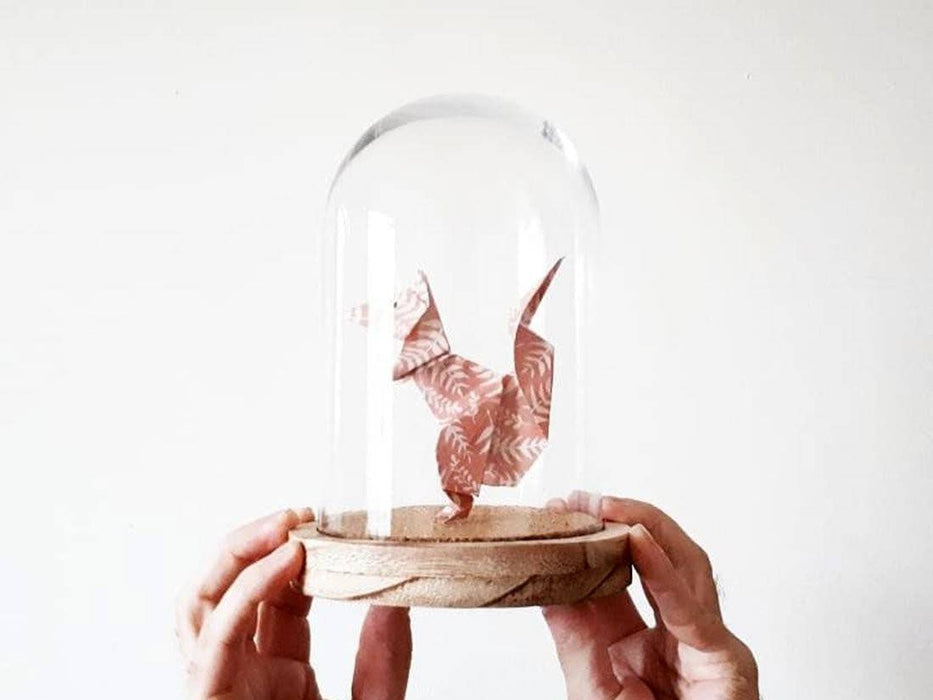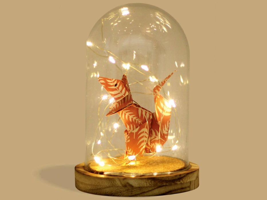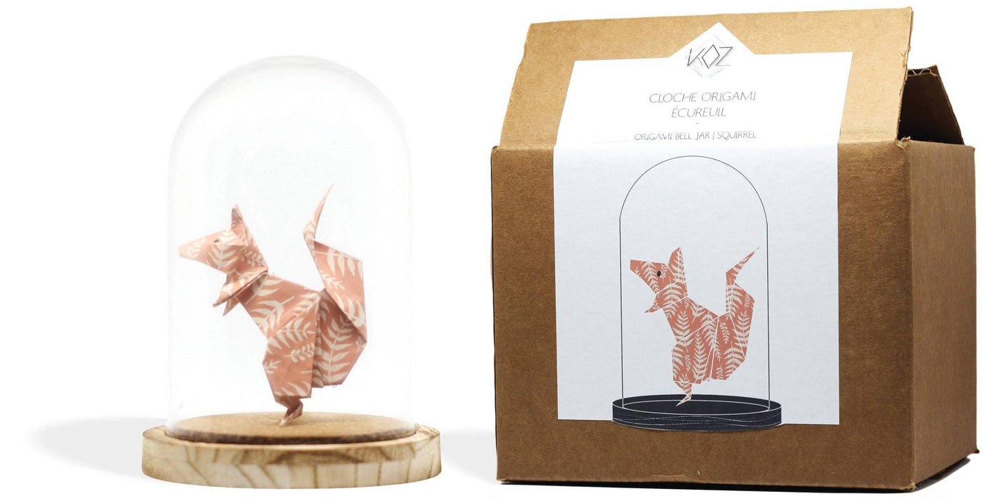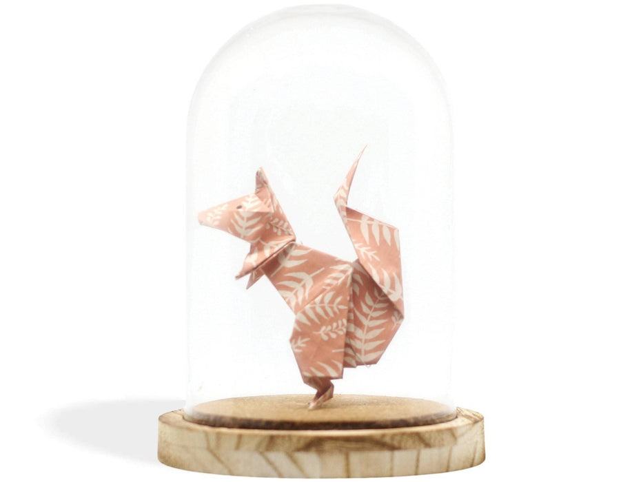 Cloche décorative contenant un modèle d'origami (l'art japonais du pliage de papier) - ici un écureuil plié dans un papier à motif marron avec feuillage blanc. Réalisée à la main, cette cloche est prête à être posée sur une étagère, une table ou un bureau pour venir compléter n'importe quel décor! C'est un objet unique et original à offrir en cadeau ou pour se gâter.