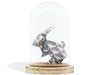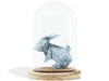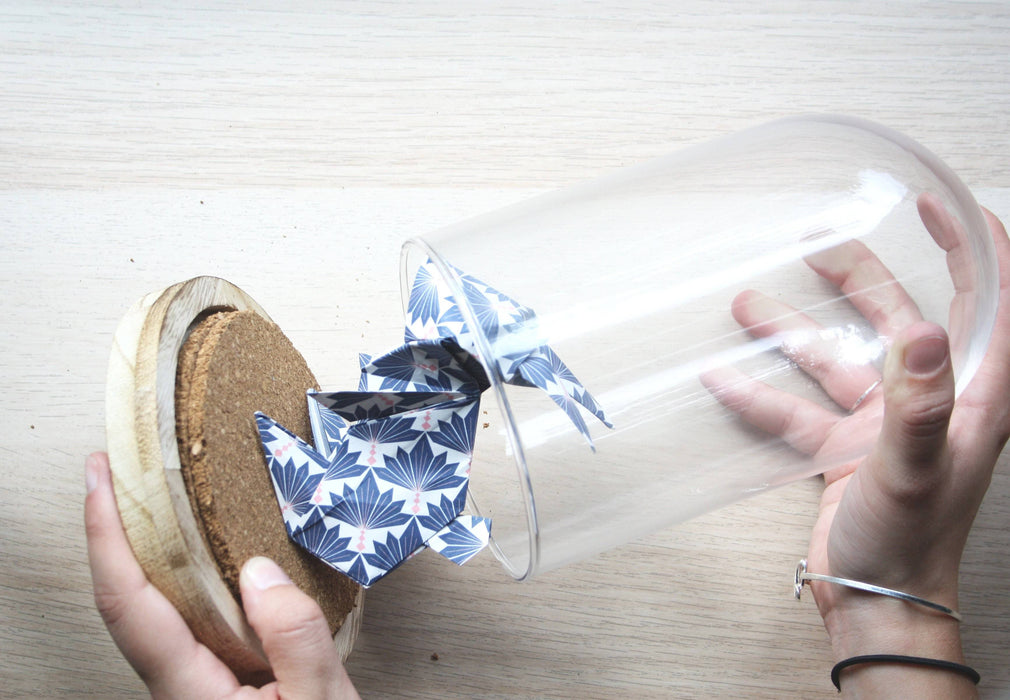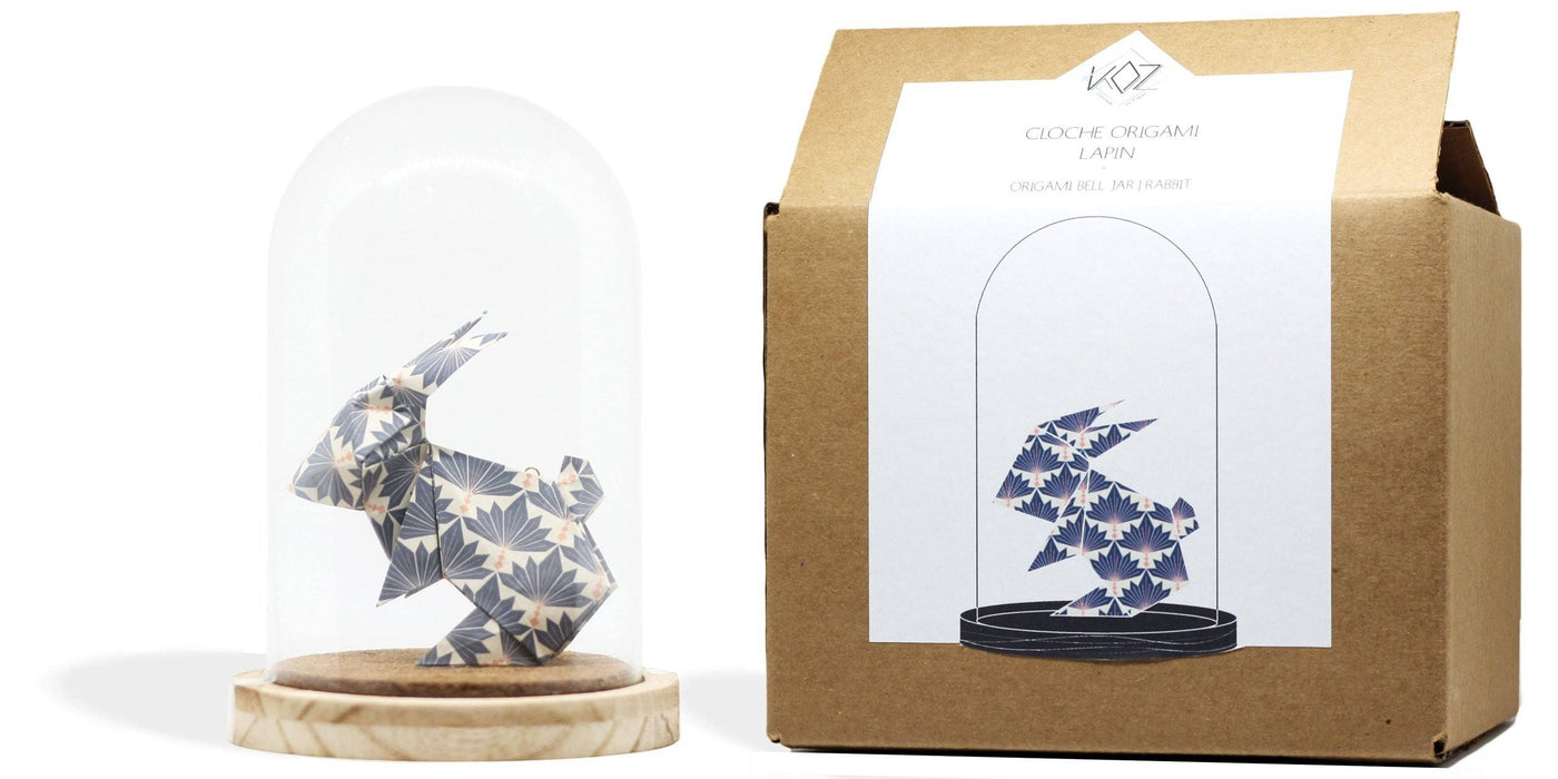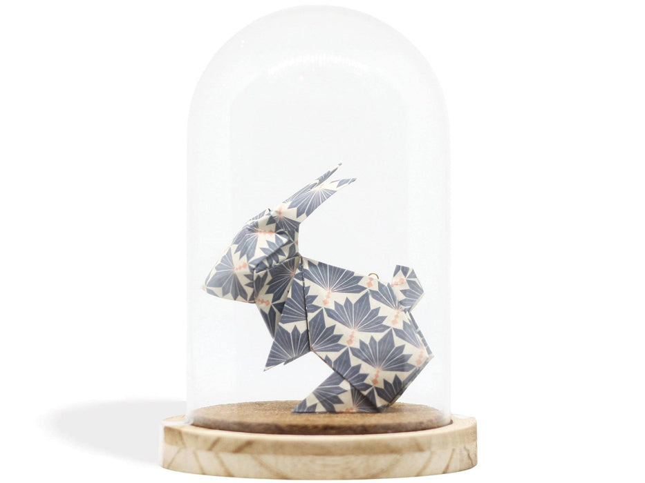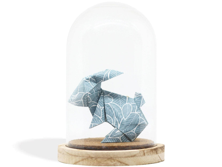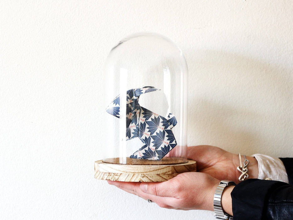 Cloche décorative contenant un modèle d'origami (l'art japonais du pliage de papier) - ici un lapin plié dans un papier à motif bleu avec feuillage blanc, ou rose avec éventails bleus. Réalisée à la main, cette cloche est prête à être posée sur une étagère, une table ou un bureau pour venir compléter n'importe quel décor! C'est un objet unique et original à offrir en cadeau ou pour se gâter.