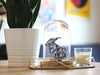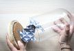 - Matériaux: Cloche en verre avec socle en bois clair, Papier à motif, Fil métallique, Liège.