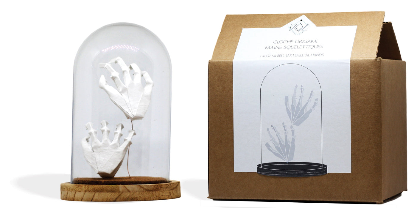 Cloche décorative contenant un modèle d'origami (l'art japonais du pliage de papier) - ici deux mains de squelette pliées dans du papier blanc. Réalisée à la main, cette cloche est prête à être posée sur une étagère, une table ou un bureau pour venir compléter n'importe quel décor! C'est un objet unique et original à offrir en cadeau ou pour se gâter.