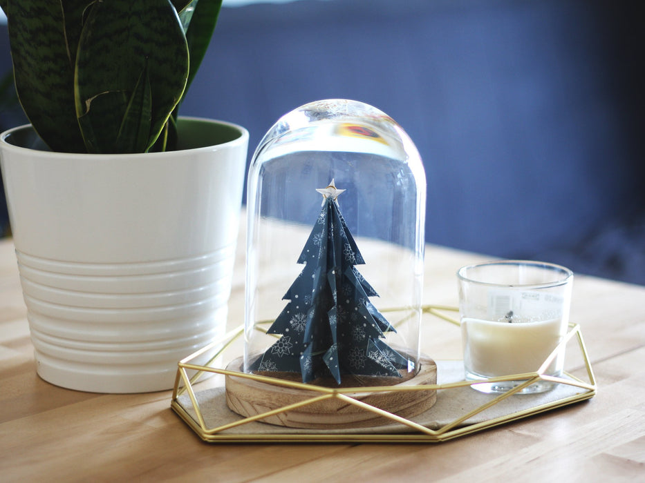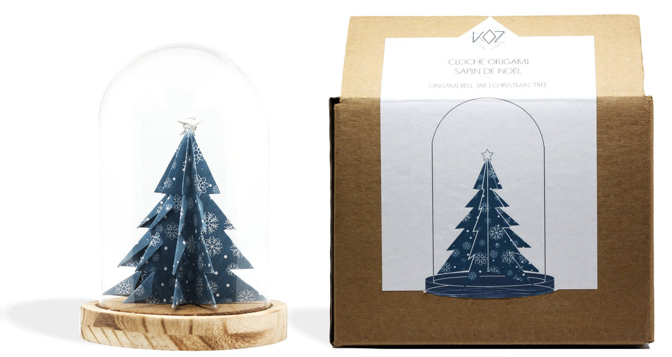 Cloche décorative contenant un modèle d'origami (l'art japonais du pliage de papier) - ici un sapin plié dans un papier à motif bleu-vert avec des flocons blancs. Réalisée à la main, cette cloche est prête à être posée sur une étagère, une table ou un bureau pour venir compléter n'importe quel décor! C'est un objet unique et original à offrir en cadeau ou pour se gâter.