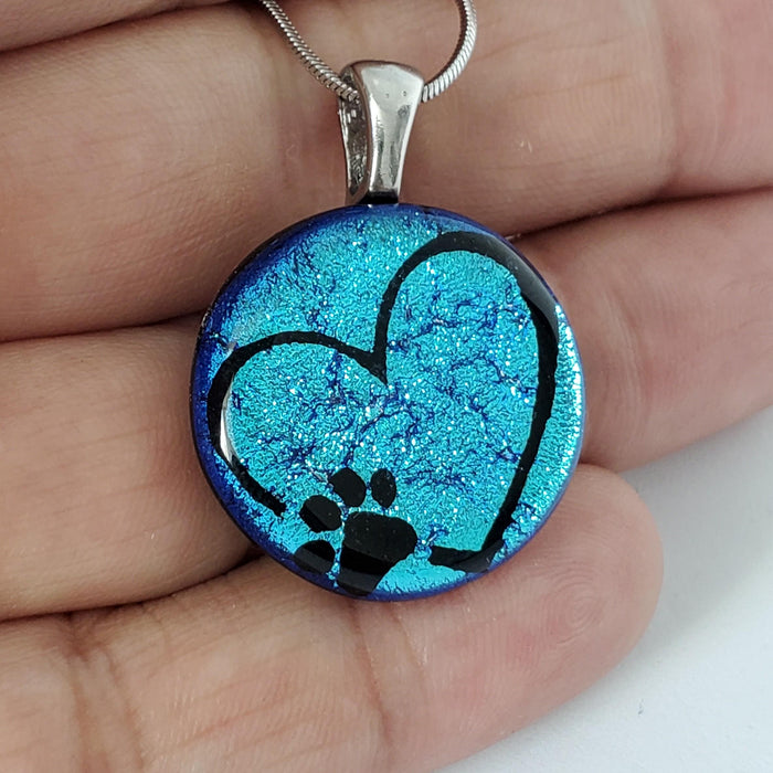 Pendentif de verre fusion, avec un motif d'un coeur, avec une trace de patte, montré sur les photos sur le fond violet ou bleu/turquoise! Vous pouvez choisir dans la liste la couleur de votre choix pour remplacer le violet ou bleu/turquoise. L'image sera TOUJOURS de couleur NOIRE! Vous pouvez voir le détail des couleurs disponibles en consultant ma charte de couleurs, un aperçu est dans les images, et le détail est disponible ICI