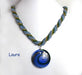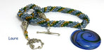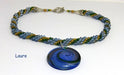 Le collier Laure est crocheté avec des perles de rocaille tchèque de couleur bleue, complétée avec des perles de verre or et vert.