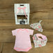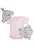 Ensemble cache-couche rayé rose, chapeau et bandana réversible à motif de rayures roses et chats dormeurs.