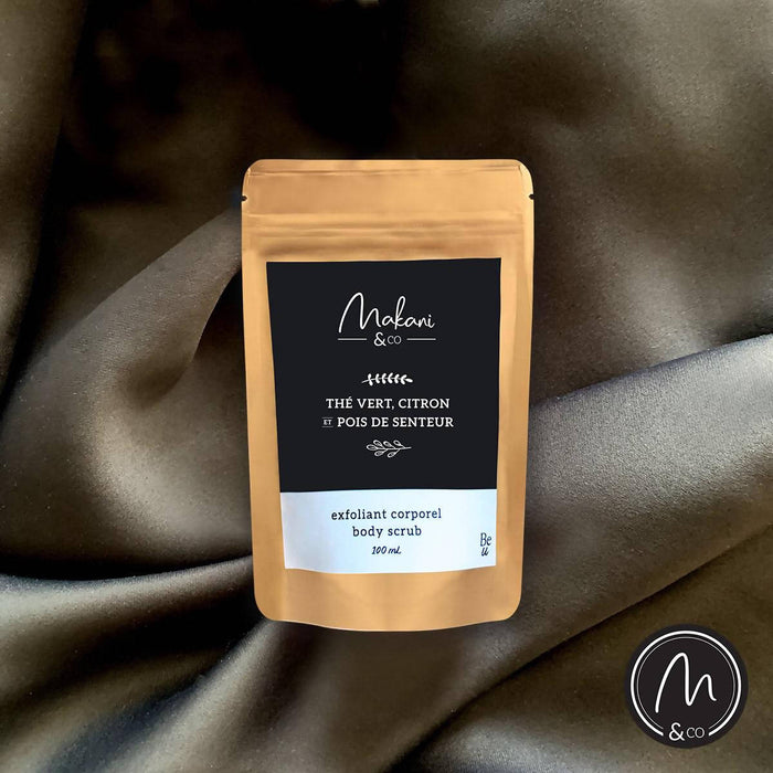 - Notre exfoliant de la gamme de produits pour le corps Makani & Co.Végane et non-testé sur les animaux, il est sans sulfate, parabène, pétrole ni silicone. Fait d'ingrédients naturels ici à Montréal!Relaxez votre corps en vous offrant cette douce exfoliation aux grains de sucre, afin de renouveler votre peau.Composé d’huile de coconut nourrissante, de vitamine E et de sucre, cet exfoliant vous offrira un moment de détente incomparable. Fragrance de thé vert, citron et pois de senteur - développé par Makani & Co et Be-u Cosmétiques