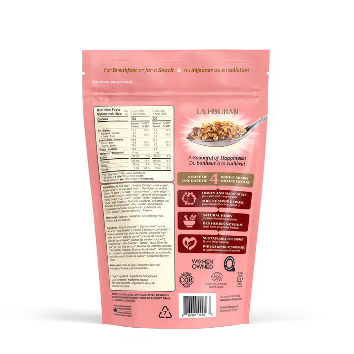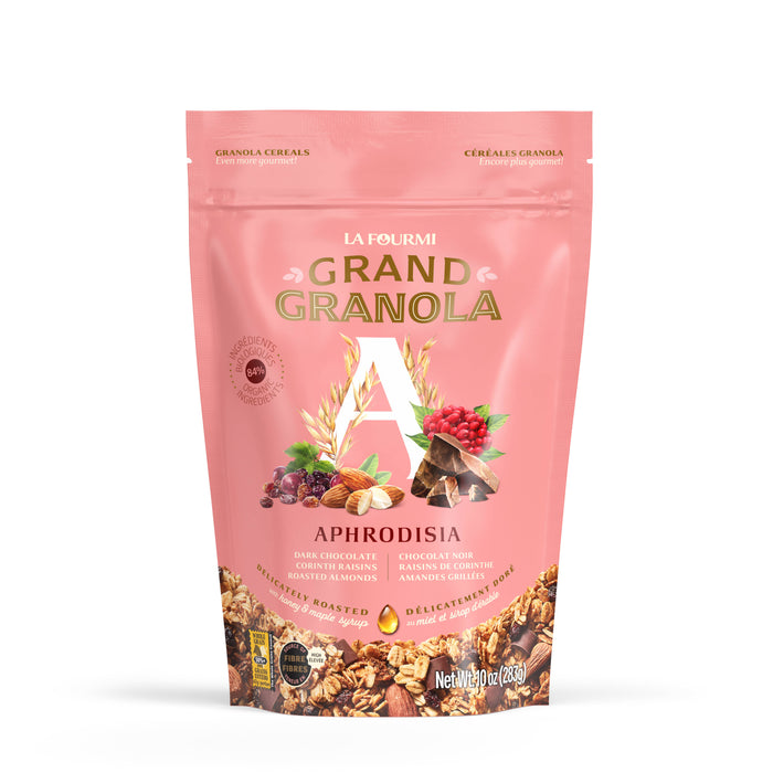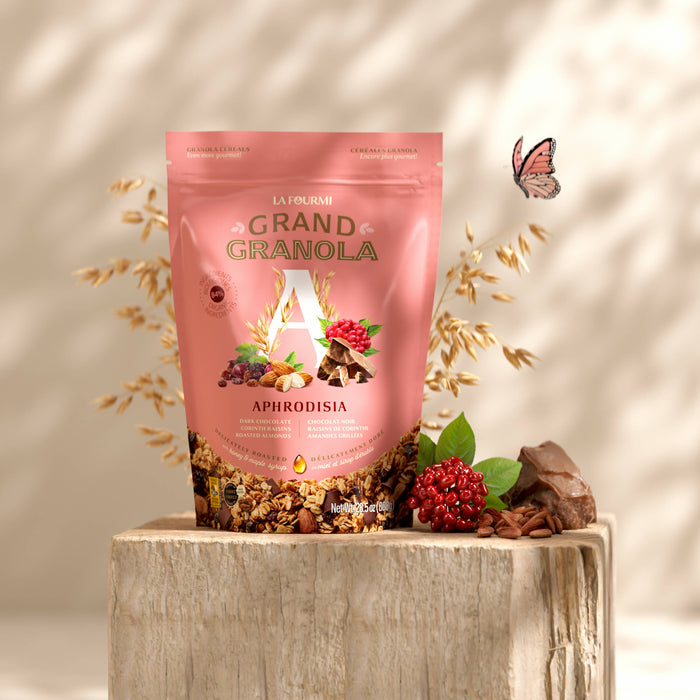 Le Grand Granola Aphrodisia est un mélange granola énergisant aux céréales québécoises et biologiques. Grande vedette de la gamme, ce granola séduit par son caractère à la fois amer et sucré, combinant les propriétés du chocolat noir et du ginseng sibérien biologiques.