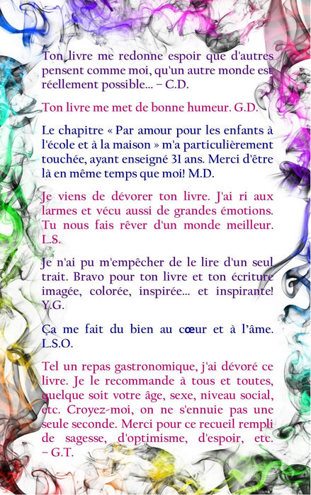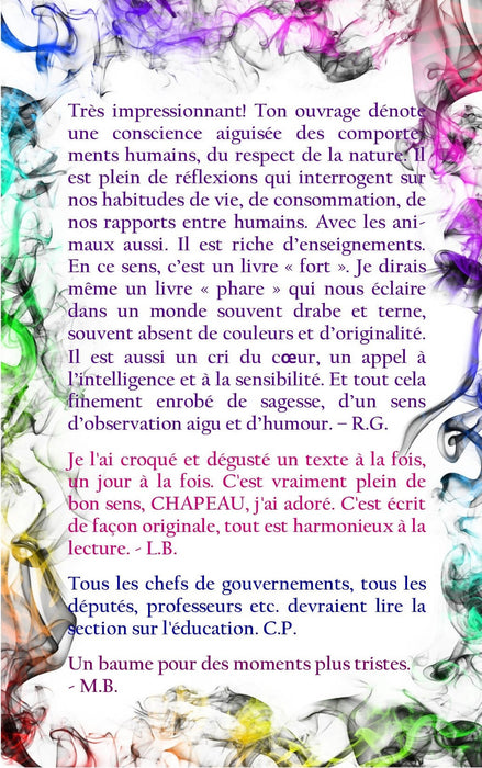 L'auteure décrit, en humour et gros bon sens, à quoi ressemblerait le Québec dans un monde idéal, utopique. Avec son ton unique et original, elle nous parle environnement, santé, bouffe, mode, justice, politique, chiens, préjugés, art, culture, mais aussi, elle nous présente son amour de la nature, du Québec, des gens et de la vie. Avec humour en prime!