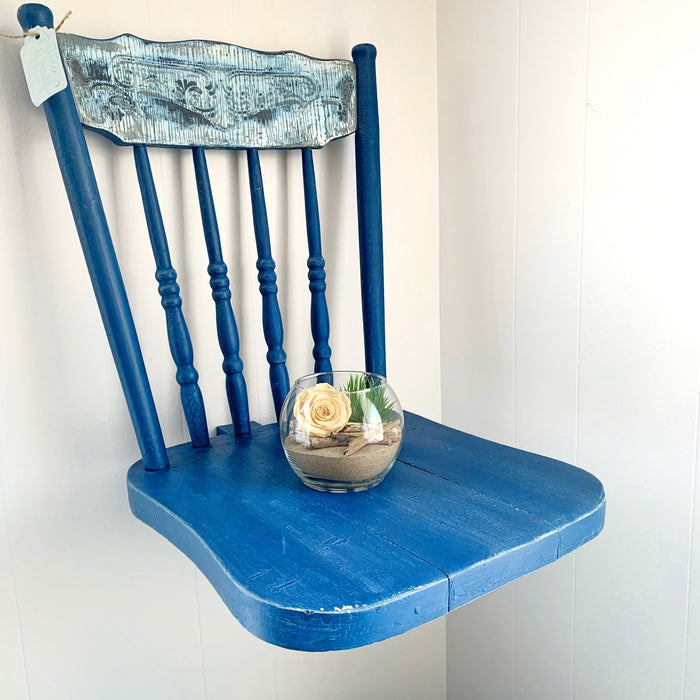 Qui dit chaise brisée dit transformation! Cette demi-chaise sert maintenant de tablette ou même de table de nuit unique pour les petits espaces! En plus, nous avons fait la découverte de son merveilleux dessin sur le dossier lors du sablage et nous avons décidé de le conserver et de le remettre en valeur.