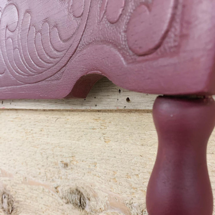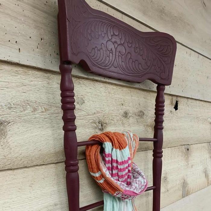 • Voici un exemple de recyclage et de réutilisation comme on les aime! Cette vieille chaise "Pressback" qui n'avait plus la force de tenir sur ses pattes a été sauvée et a une nouvelle vocation. Elle a gardé toute sa splendeur avec ce bourgogne et elle sert maintenant de support pour des foulards, des colliers, des serviettes … La liste peut être longue alors à vous de lui donner une nouvelle vie selon vos besoins!