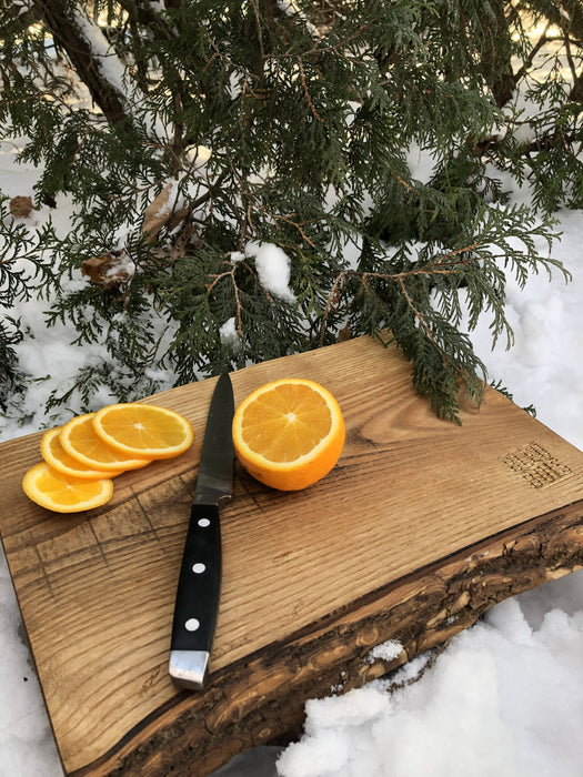• Planche en frêne d'ici, unique et pratique pour découper et présenter vos produits.