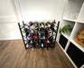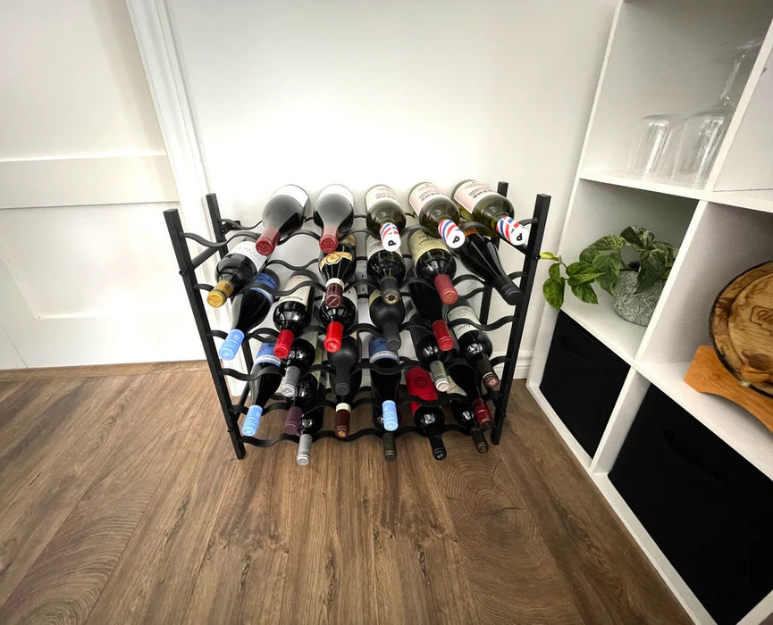 Les barres métalliques ondulées maintiennent fermement les bouteilles par le col et la base, assurant leur stabilité. Fixez le support autoportant au mur avec les ancrages fournis pour encore plus de sécurité.DIMENSIONS ET CAPACITÉ