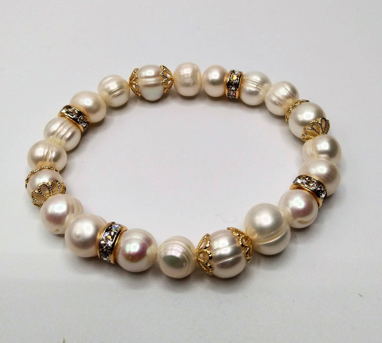 Bracelet sur fil élastique 7,5 pouces avec des perles d'eau douce blanches et des éléments en argent 925 plaqués or 14k.