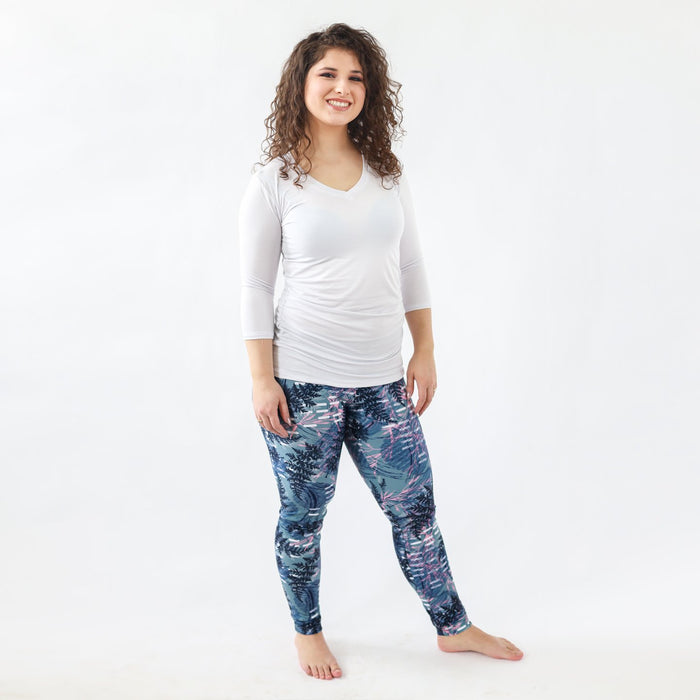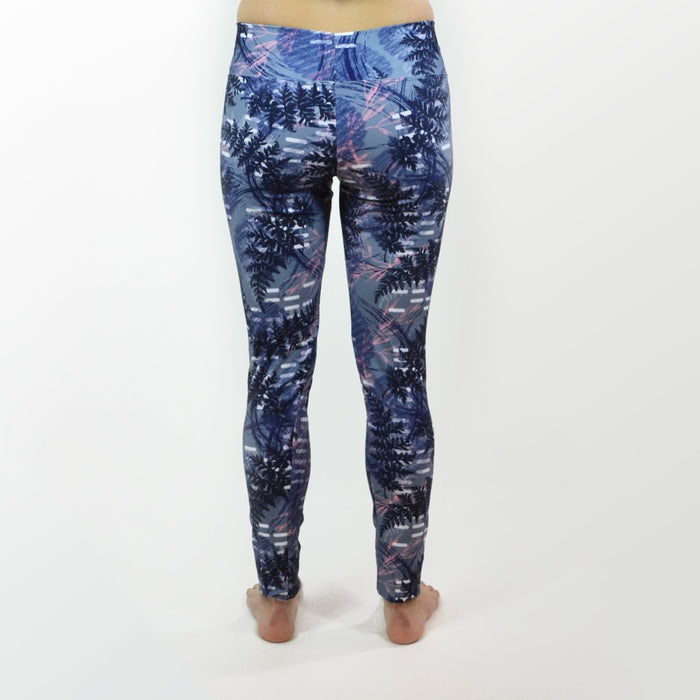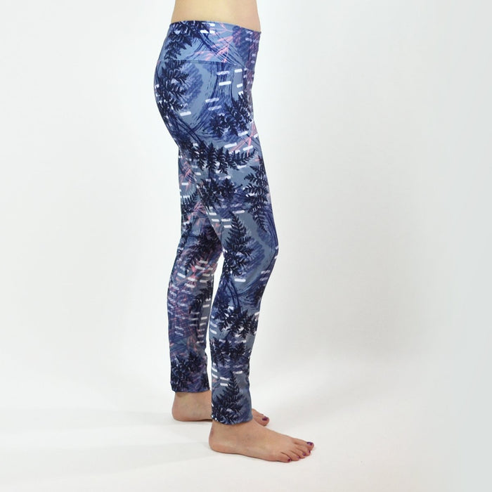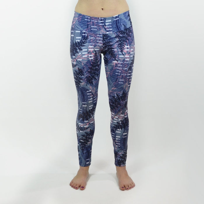 Legging long en polyester-lycra, avec motif de feuillage bleu marin sur fond gris acier. Bande de taille large, style yoga.