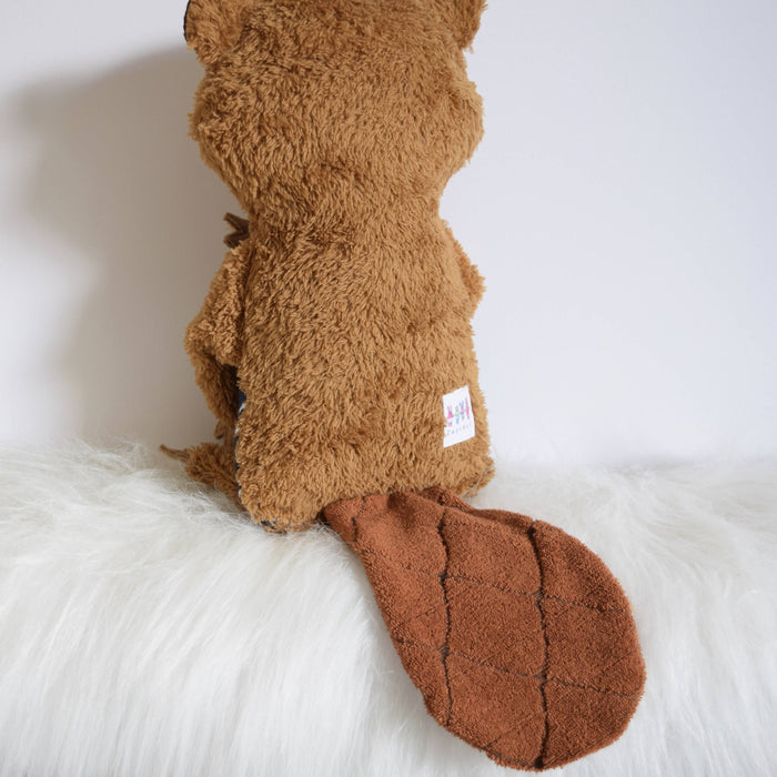 Détails : mesure 17po / 43cm. Son corps mesure 6 1/2 X 12 po Matériaux : Fait de tissus récupéré et de tissus neuf. : peluche, polar, coton et boutons de plastiques sécurisés. Tous les tissus sont lavés et séchés à la machine avant la fabrication. La bourrure 100% polyester. Elle est accessible à tous les enfants.