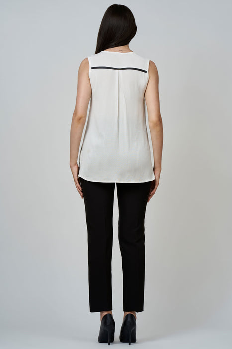 Blouse ample asymétrique avec empiècements et passepoils en rayonne cirée sur le devant et dos. Belle coupe attrayante pour silhouette. Tissus léger 100% Viscose. Longueur de l'ourlet asymétrique et fentes latérales permettant de porter la blouse de différentes façons.