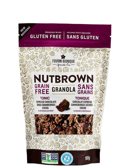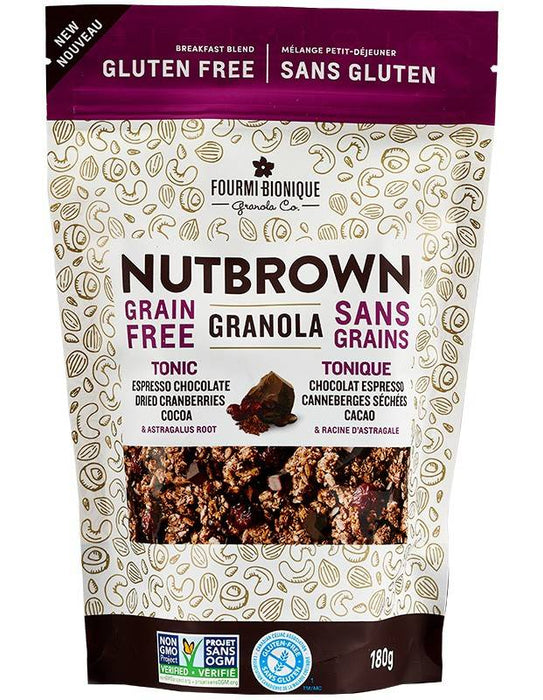Le granola paléo sans gluten Nutbrown Tonique est un mariage de notes acidulées qui offre une expérience unique pour les sens. Chocolat noir expresso biologique et équitable et canneberges québécoises, ce mélange sans céréales ravira les amoureux du café à la recherche d'un granola sain.