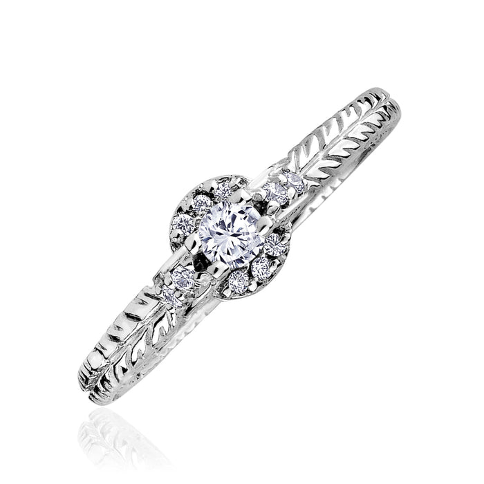 Trop mignonne cette jolie bague de style vintage avec ses gravures sur le corps, en or 10K, jaune ou blanc. Diamants scintillants sont regroupés autour du centre pour un total de 20 points.