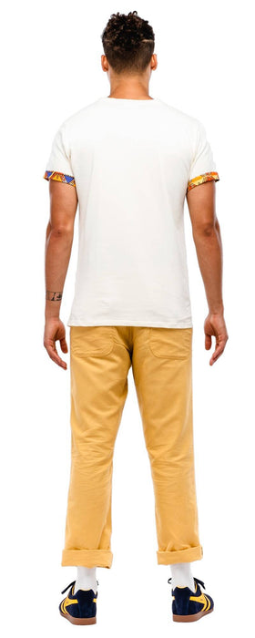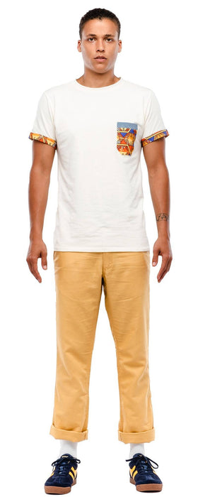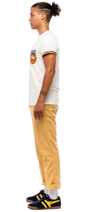 Coupe unisexe, légèrement ajusté et allongé. Couleur: naturel. Empiècement sur les manches et poche sur le torse en mousseline imprimé. Motif exclusif “terre des hommes”. Couture ton sur ton. Col ras du cou en maille côtelée.