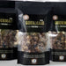 • Un maïs soufflé au caramel recouvert de chocolat noir et zébré une deuxième fois de chocolat noir puis enrobé de fleur de sel.