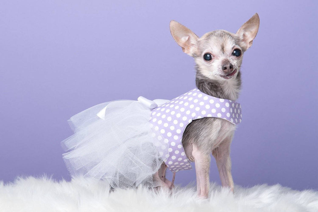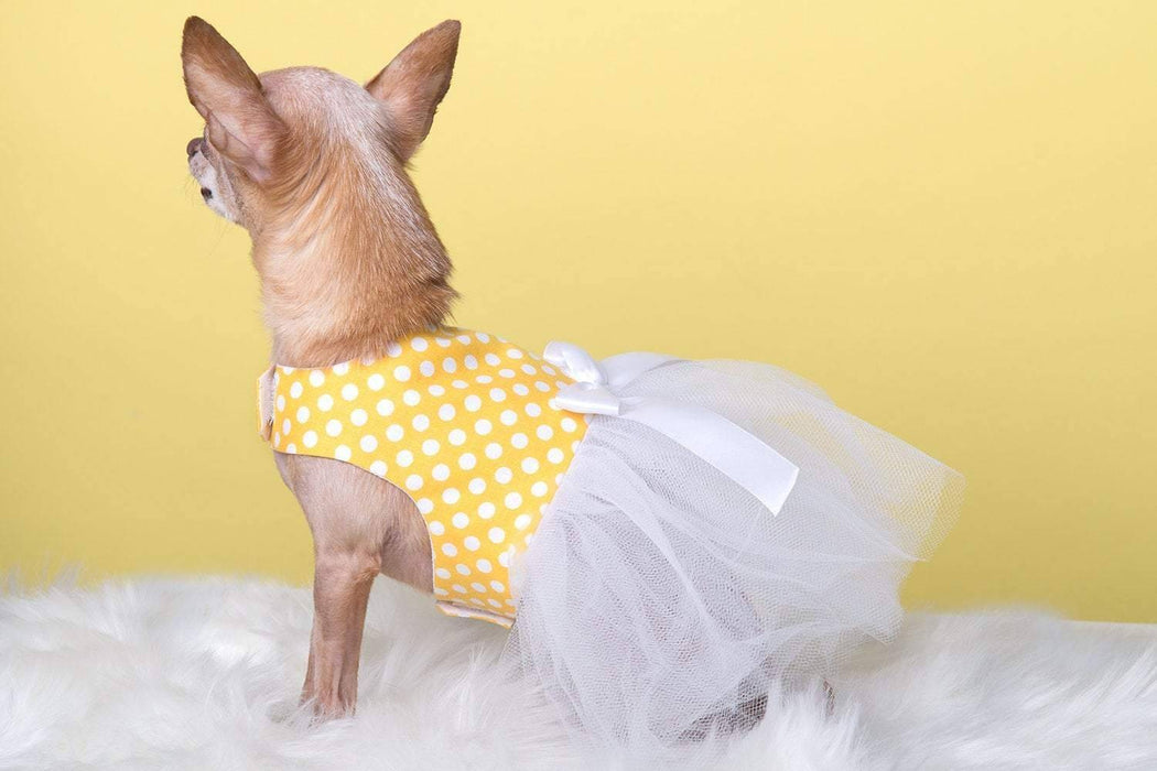 Livraison internationale. Frais de livraison gratuits au Québec et au Canada. Robes tutu pour chiens à pois blancs sur fond de couleur pour Pâques, printemps et été , plusieurs couleurs disponibles. 100% coton, jupe entièrement en tulle (tutu) blanc. S'attache avec du velcro au cou et à la poitrine. Option D-ring disponible sur demande (harnais), formats XXXS, XXS, XS, S, M et L. Collection Printemps 2019 Shantell design. À titre de référence