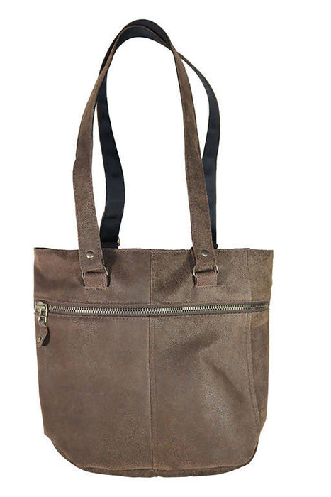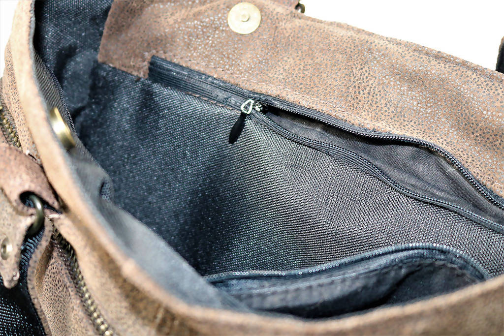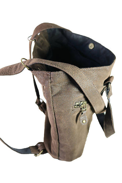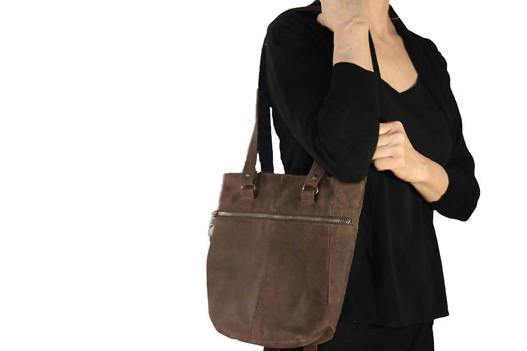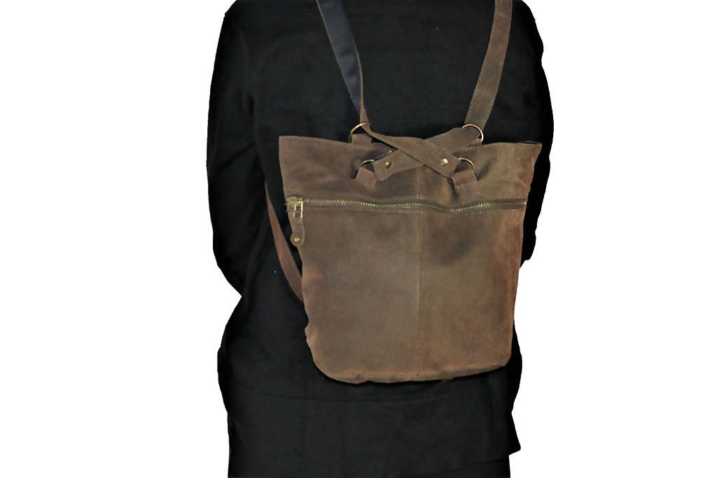 Joli sac cabas et sac à dos tout-en-un. Fait à partir de suède recyclé ( des manteaux de moins aux poubelles, bon pour l'environnement). Ce sac est très pratique avec multiples pochettes avec fermeture éclair. L'intérieur est en polyester imperméable et endos polyuréthane. Dimension: Hauteur: 10 1/2'' (26.5 cm) largeur:13'' (33 cm) fond: 3 3/4'' (10 cm). Couleur: brun