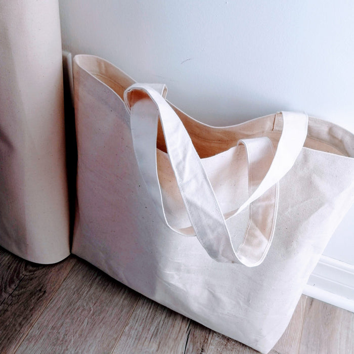 Sac réutilisable en coton naturel de type fourre-tout avec ganses longues, fabriqué au Québec, Canada. Fait en 100% coton naturel de 315GSM