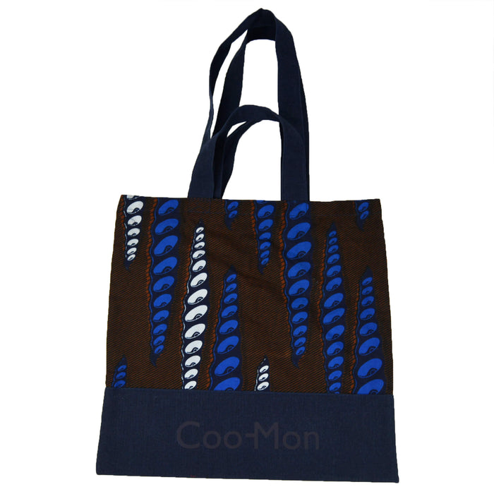 Sac réutilisable brun et bleu pour les courses et le marché fait en pagne africain recyclé 100% coton et tissu canevas pratique pour la vie de tous les jours.