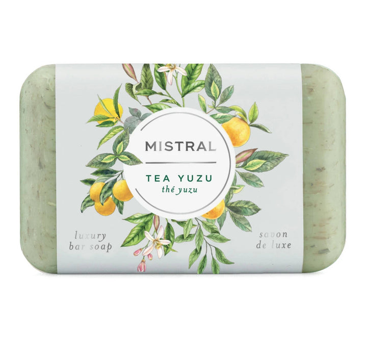 Un mélange énergisant et harmonieux de zeste de yuzu, de bergamote pure et de feuilles de thé vert associé au jasmin, à l'iris et à la menthe fraîche. Découvrez ce savon français ultra riche au lait de Mistral, fabriqué à la main en Provence.