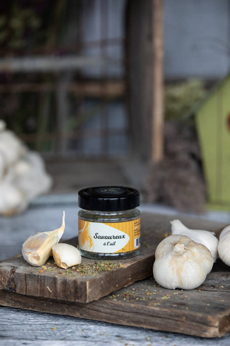 Ingrédients: Ail du Québec, fleur d'ail, origan, cayenne, thym, fleur de sel.