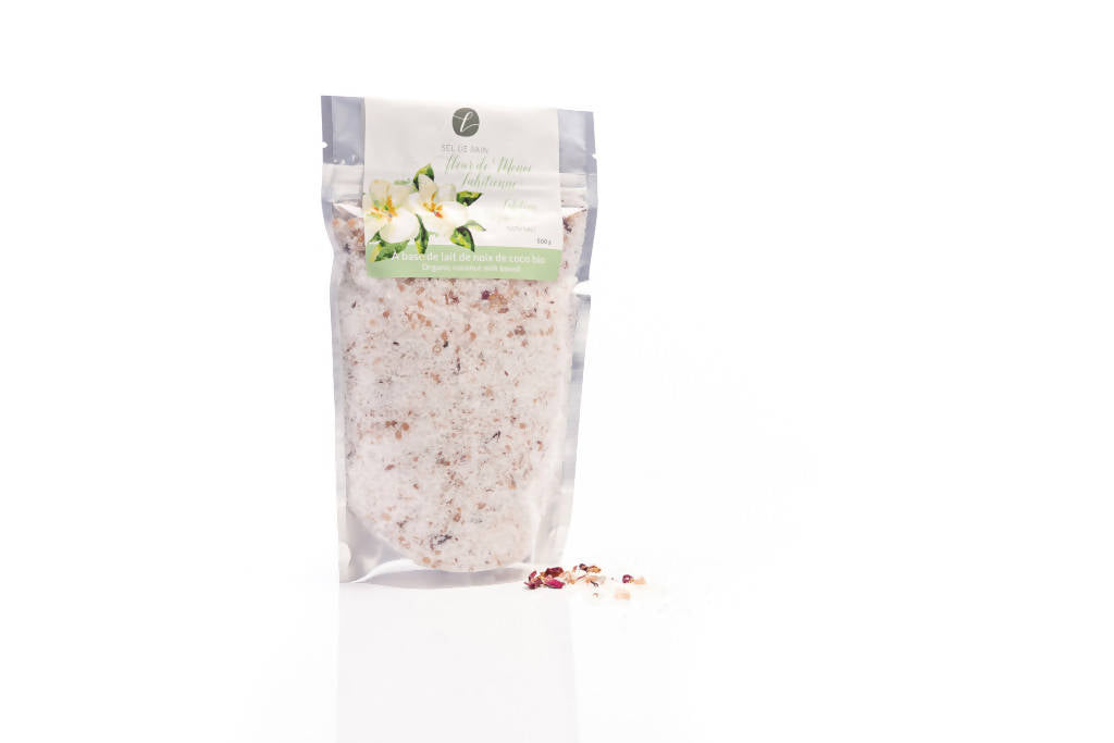 Magnesium sulfate (sel d’epsom), sodium chloride (sel rose de l’himalaya), dentriticsalt (sel dentritique), *Dehydratedcoconutmilk, maltodextrin and milkprotein (lait de coco en poudre bio), baking soda (bicarbonate de soude), fragrance naturelle, fleurs séchées.