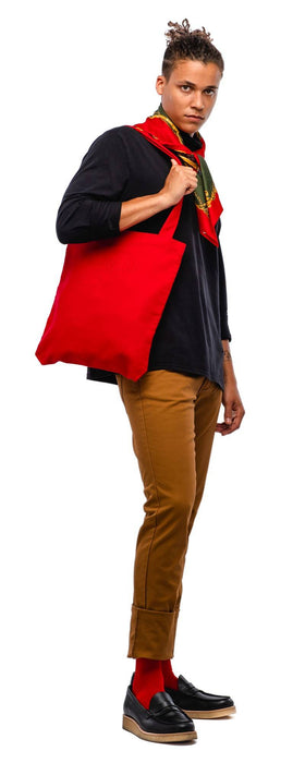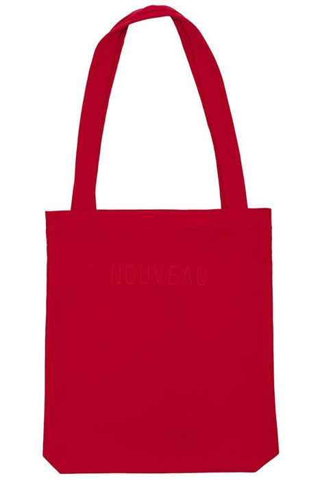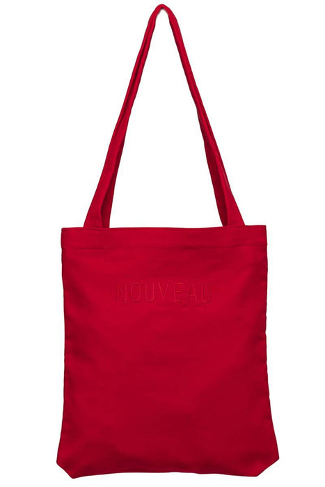Tote bag en moleskine. Peut contenir une encyclopédie. Couleur: rouge. Broderie ton sur ton signature "nouveau". Couture ton sur ton.