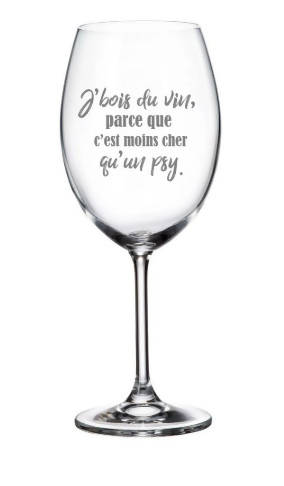 - Gravure au laser avec inscription « J'bois du vin parce que c'est moins cher qu'un psy. »