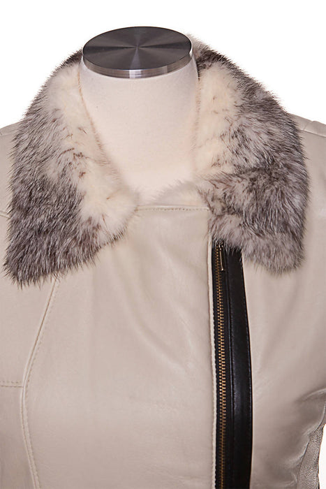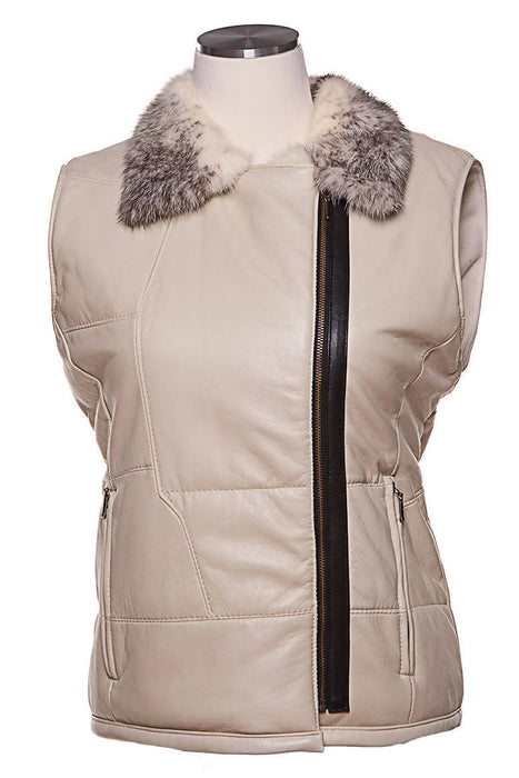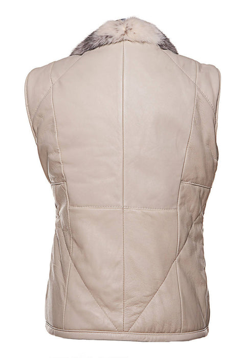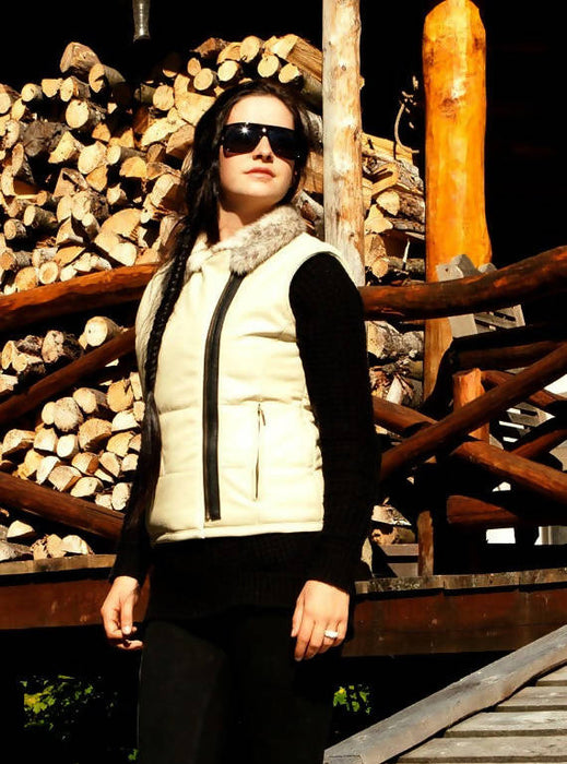 Veste sans manche en cuir d'agneau garni d'un col de fourrure en vison recyclé marbré de noir et crème. Orné d'une jolie bande noire décorative Deux poches extérieures avec fermeture éclair. L'intérieur doublé d'un fin lainage et de l'isolant Primaloft. Couleur: crème.